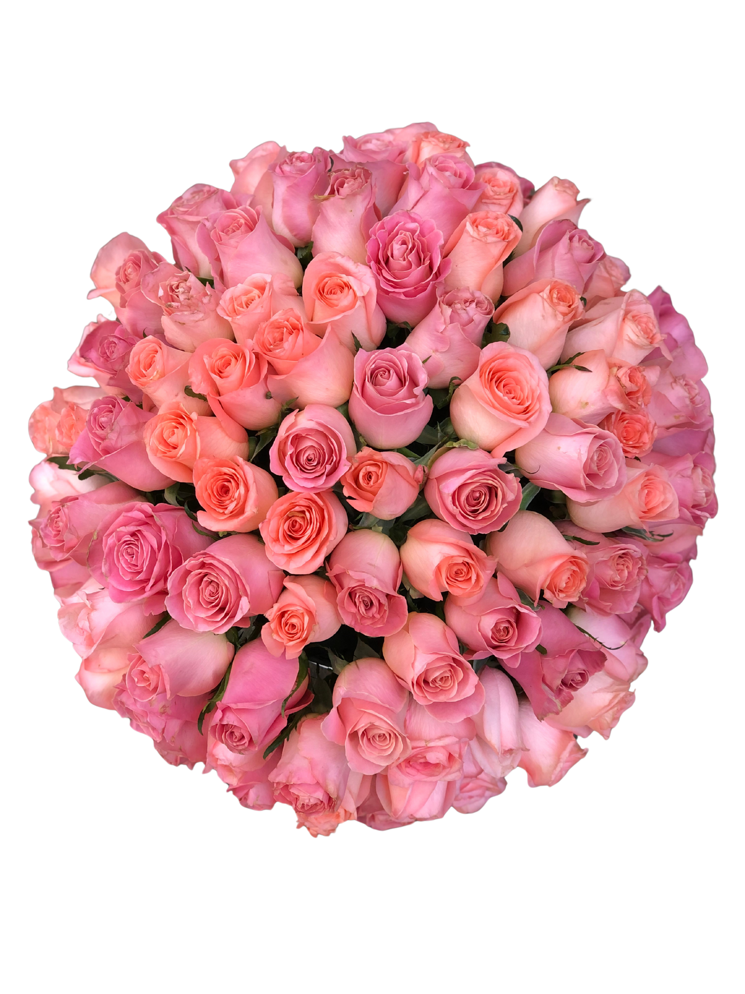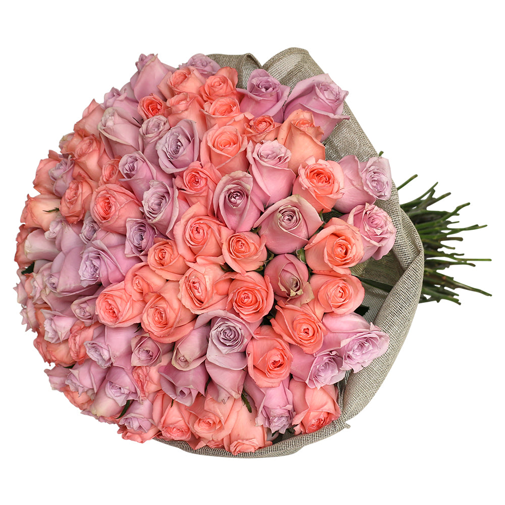 • Ramo de 150 rosas color rosa envueltas en costal